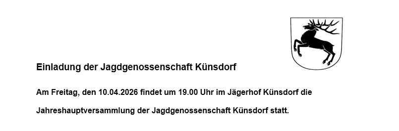 Einladung der Jagdgenossenschaft Künsdorf, Freitag 10.04.2026 um 19:00 Uhr